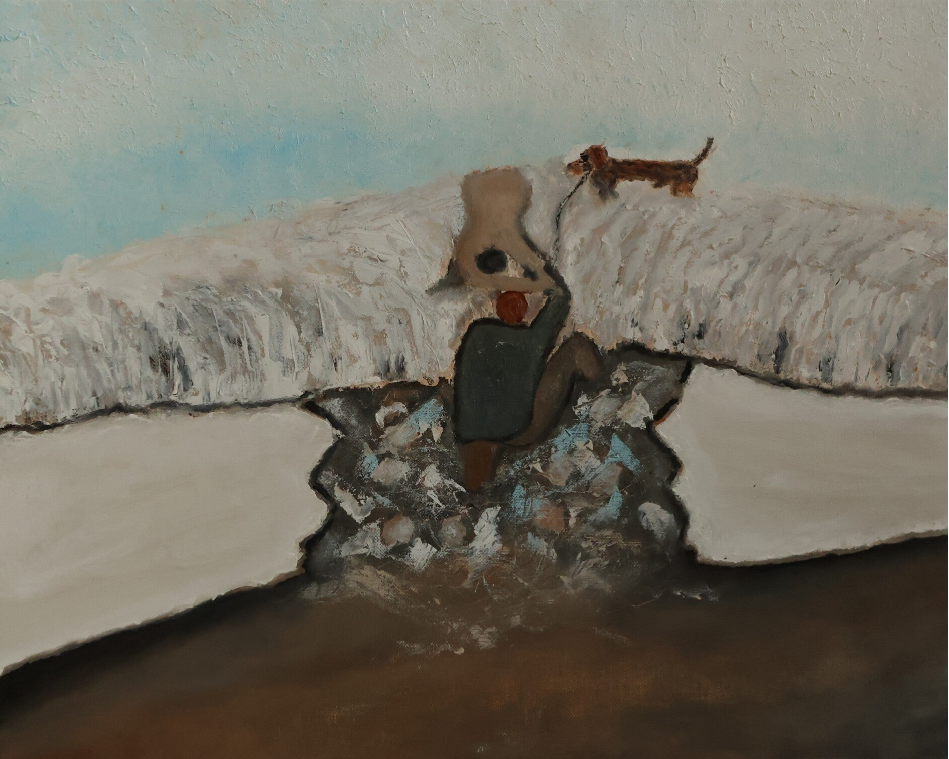 Pip kan zelf niet op het ijs. Dus ik moet erin, om hem te redden.